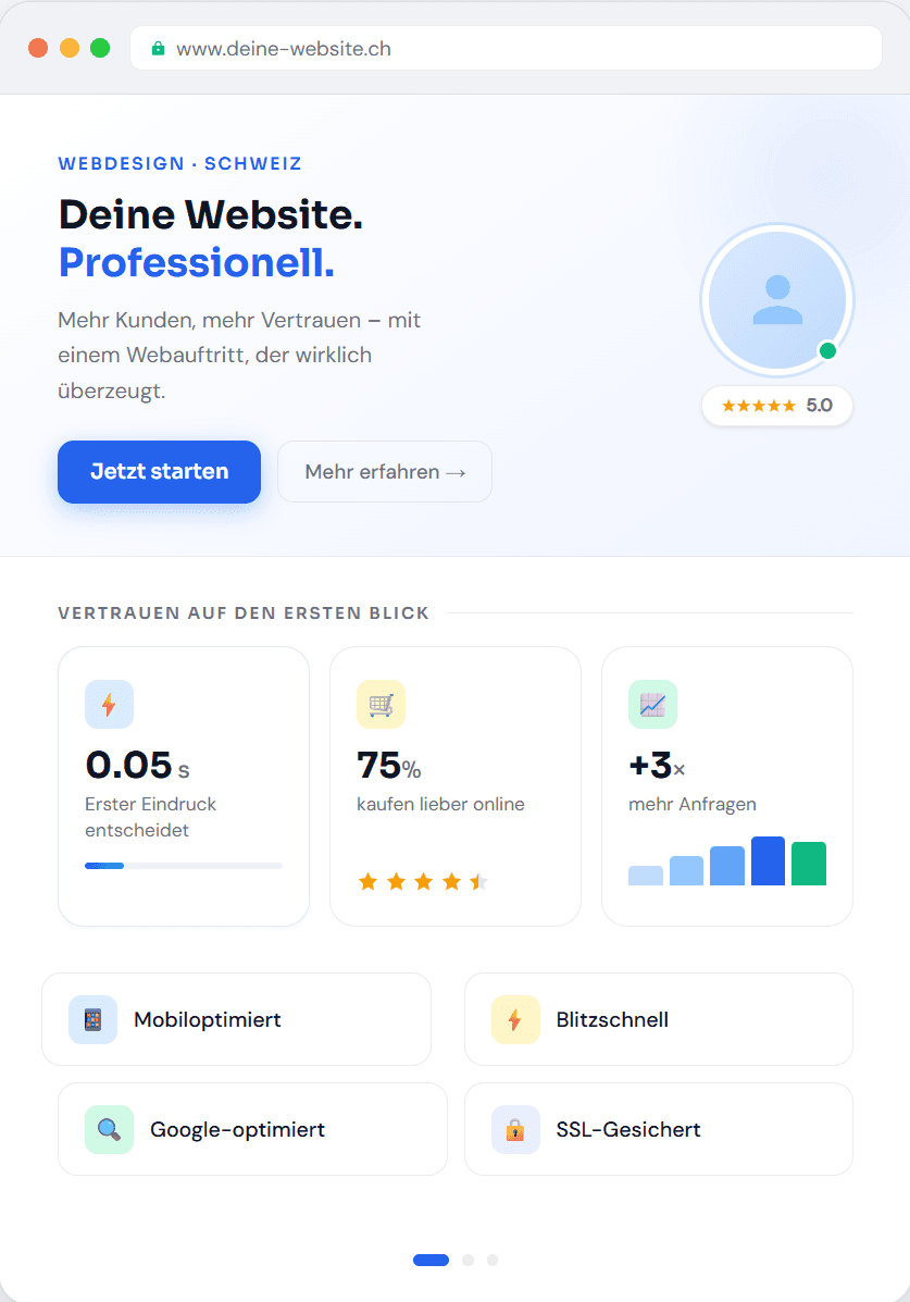 Eine professionelle Website schafft sofort Vertrauen, überzeugt auf dem Handy genauso wie am Desktop – und arbeitet 24/7 für dein Business. Wer online nicht überzeugt, verliert Kunden an die Konkurrenz.